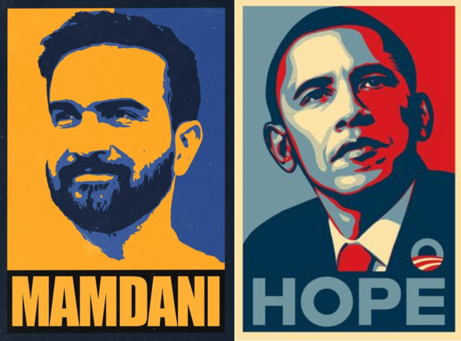 → Mamdani (2025) = design incarné, ancré, vernaculaire. Ses visuels disent : "Je suis déjà parmi vous. On est déjà ensemble." (bon ok, sauf celui juste au dessus, qui est un détournement du poster Hope ^^)