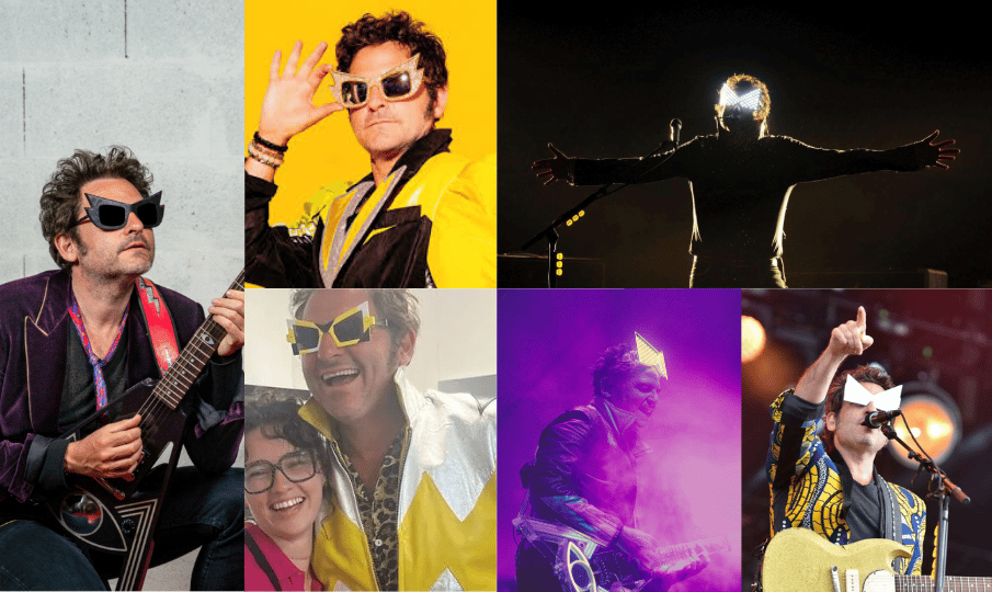 Rêvalité, 2022 💜 Ère violette Costume violet + guitare custom "Flying-M-" avec logo troisième œil lumineux.