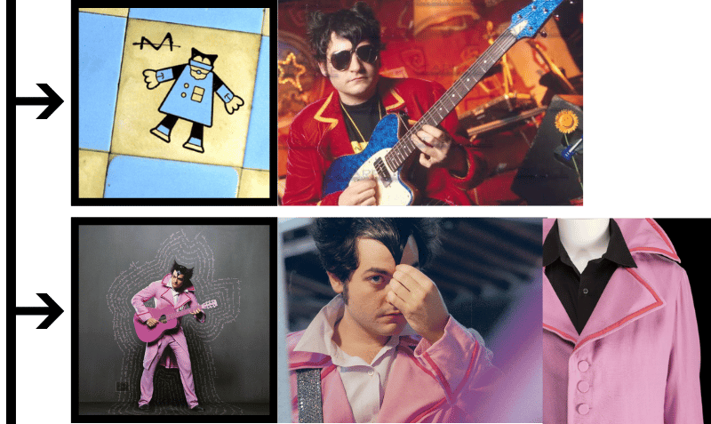 ✅ Costumes flamboyants monochromes : une seule couleur dominante par ère, mais portée à fond. ✅ Travail avec des artistes & designers de mode. ✅ Pantalons slim + vestes longues aux cols relevés en pointe : silhouette signature reconnaissable instantanément ✅ Chaussures Repetto "Zizi" : richelieu en cuir lacé noir et blanc : les mêmes que portait Serge Gainsbourg. Un clin d'œil assumé à la tradition chanson française.