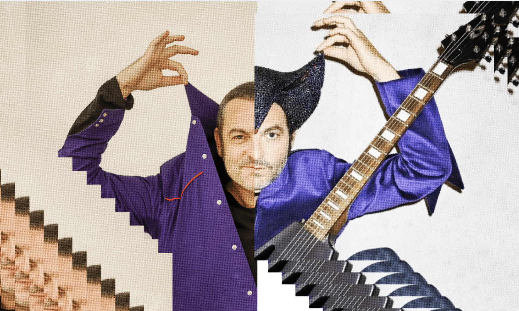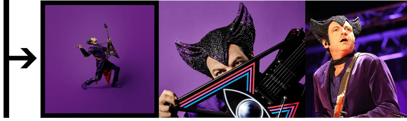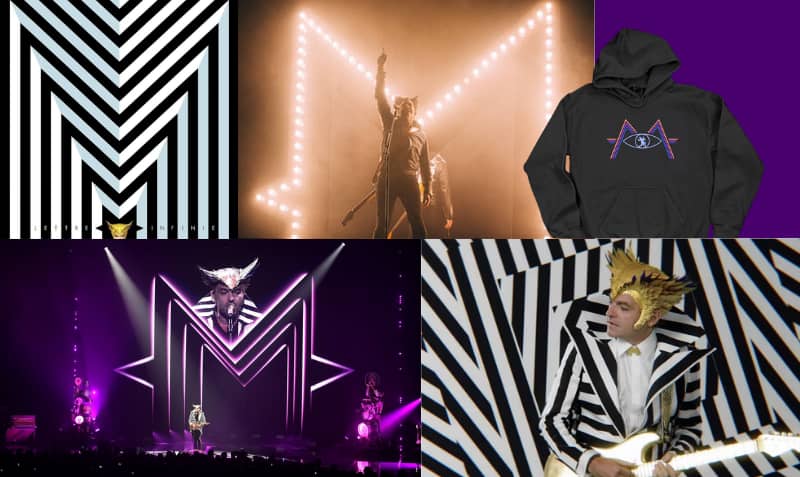 Plus récemment, pour la tournée Rêvalité, il débarque avec la "Flying-M-" une guitare custom avec un logo troisième œil lumineux intégré. Tu vois ce que je vois ? Même ses instruments sont brandés. Ils portent le symbole, la couleur de l'ère, l'émotion du moment.