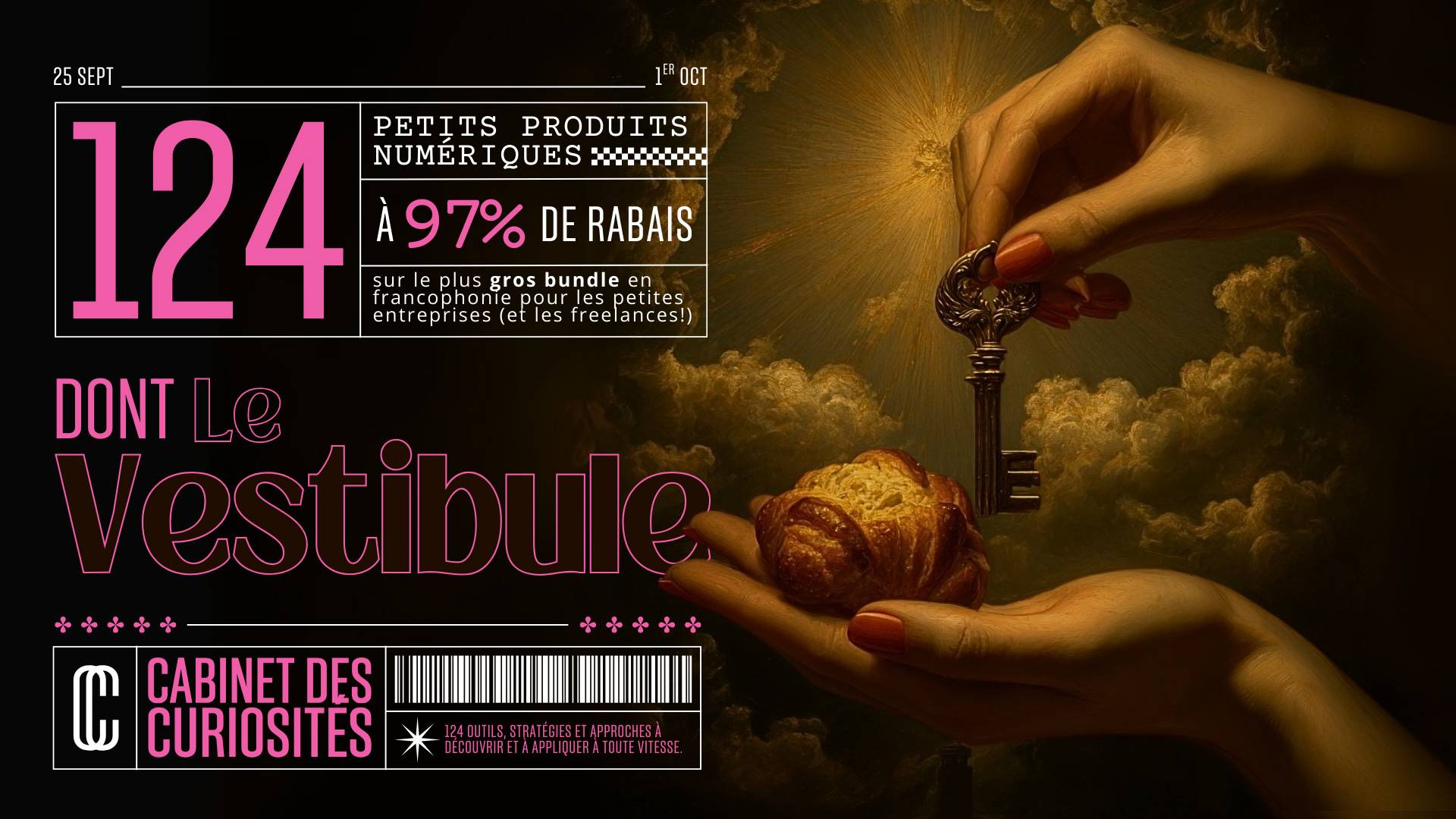 C'est l'inverse des formations avec 12 heures de vidéo à regarder. Exemple ? C’est exactement ça l’esprit du bundle : des ressources prêtes à l’emploi, qui te font gagner du temps ET qui posent direct les bonnes bases pour faire grandir ton business. 124 petits produits vendus ensemble, à un petit petit petit petit petit petit prix : 199€ (au lieu de 6000€) Elle est où la douille ?Pourquoi c'est si peu cher ? Parce que la vente est éphémère, tout simplement :) Pourquoi on accepte de vendre tous ensemble ? La seule douille selon moi, c'est le FOMO lié à la courte durée de vente. Mais ça... c'est un peu un mal pour un bien. Et j'ai l'impression que globalement on essaie tous de vendre de manière éthique. 🗝️ À l’heure où je t’écris, les créateurices du Cabinet des curiosités ont déjà explosés les compteurs avec un total de +130 personnes qui ont choisi de nous rejoindre rien qu'aujourd'hui. Et tu veux savoir un secret ? J’en suis actuellement à -- roulement de tambour -- 0 vente. Zéro. Nada. 🫠 (mais j’ai quand même déjà 10 personnes qui ont choisi d'ouvrir mon produit hein → mini victoire 🥹). Donc je prends toutes les marques de soutien : les GIF de chat mignon, les mots de love, et les ventes ! ;)