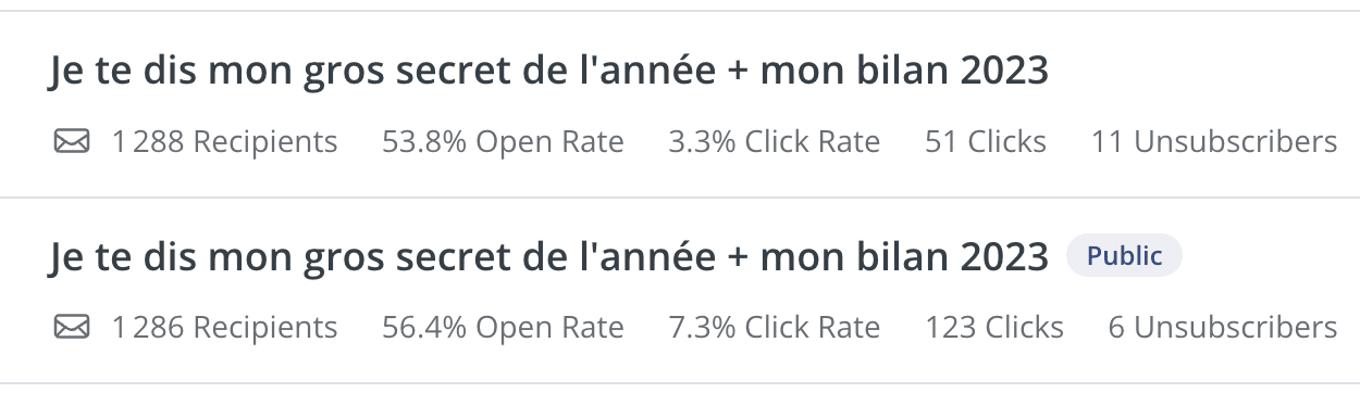 Et oui, la semaine dernière j'ai fait une boulette, j'ai envoyé mon mail avec le même objet que la semaine d'avant. Oups. J'ai demandé ton avis sur Insta et tu m'as dit d'attendre les stats à 48h, alors voilà, toi et moi on apprend un truc ensemble →